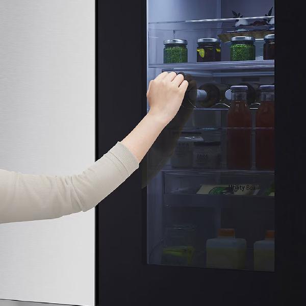 Refrigerador InstaView negro con luz interior visible y rayos azules de DoorCooling.